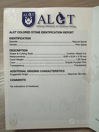 Vendo Spinello Naturale (Natural Spinel), certificata da ALGT con le seguenti caratteristiche: •Varietà: Pink Spinel •Taglio: Cushion, Mixed Cut •Dimensioni: 6.85 × 6.24 × 3.78 mm •Peso: 1.26 carati •Colore: Grayish Purplish Pink •Origine: Myanmar (Burma) •Trasparenza: Transparent Per richiesta informazioni, foto o fissare un incontro chiamare al: 3498298686