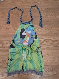 Per inutilizzo, vendo meravigliosa canotta originale Custo Barcelona in 100% pura seta, come certificato dall'etichetta in foto. Un capo unico e di altissima qualità. Dettagli: Modello: Molto particolare, incrociato sul davanti (wrap style) e allacciato dietro il collo (halter neck) con un fiocco, lasciando la schiena scoperta. Finiture: Bellissimo bordo in pizzo grigio scuro sull'orlo inferiore. Stampa: Tipica del brand, con colori vivaci e brillanti (verde, nero, arancione, azzurro) e una grafica artistica. Vestibilità: L'etichetta riporta una taglia 4 (equivalente a una L/40 USA). Tuttavia, grazie al modello morbido e allacciabile, veste perfettamente anche una taglia S o M (come l'ho indossata io), adattandosi a diverse corporature per un effetto boho-chic rilassato. Condizioni: Ottime condizioni, seta lucida e colori brillanti. Un capo per chi cerca l'esclusività. Prezzo: € 45,00 (Un prezzo eccezionale per un capo in seta Custo Barcelona in queste condizioni). Se consegna a mano Corsico (MI)