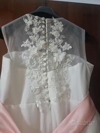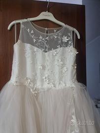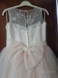 Abito per prima comunione acquistato nuovo ed indossato ovviamente una sola volta. Per bambina di 11 anni con misure nella media. Solo da lavare in quanto lo strascico si è leggermente imbruniva Toe in chiesa, al ristorante e nel prato per le foto.