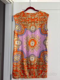 Metti un tocco di colore e vivacità nel tuo guardaroba con questo splendido abito senza maniche del brand Phard, perfetto per la primavera/estate! La fantasia barocca sui toni dell'arancione, oro e lilla lo rende unico e accattivante, ideale per chi ama distinguersi. Il taglio dritto e confortevole lo rende adatto a diverse occasioni, dal casual chic all'evento speciale.