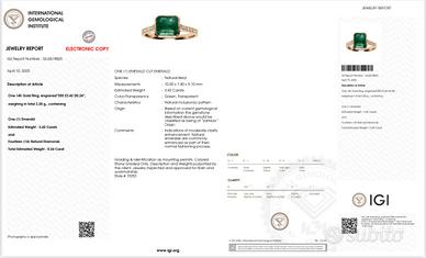 Il nostro anello è stato valutato dal Gemological Institute con il Rapporto IGI Numero 33J2618825 dell'aprile 2025.