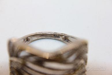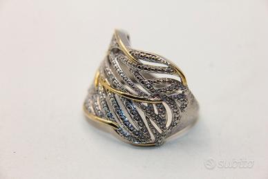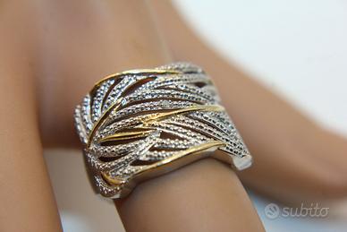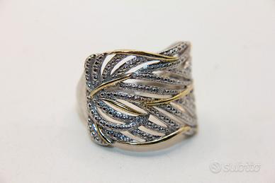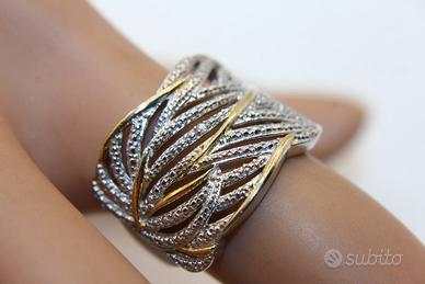 Lasciatevi sedurre dalla magnificenza di questo splendido anello a fascia, un capolavoro di design e artigianalità. Realizzato in pregiato argento sterling 925, questo gioiello si distingue per la sua complessa e ariosa struttura intrecciata che evoca l'eleganza di foglie o fili che si rincorrono. La base in argento è finemente lavorata con una texture puntinata che cattura la luce da ogni angolazione, creando un delicato effetto scintillante. A impreziosire il design, sottili fili placcati in oro giallo si snodano con grazia attraverso la trama, aggiungendo un tocco di calore e un sofisticato contrasto bicolore.
