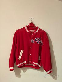 Stile: Giacca bomber o stile college con chiusura a bottoni o zip (non visibile frontalmente), caratterizzata da polsini, colletto e fondo a coste con strisce bianche a contrasto.