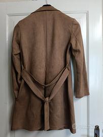 leggero spolverino misura sopra il ginocchio senza bottoni con cintura colore cammello tessuto simil camoscio con tasche laterali sfoderato