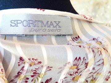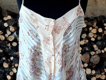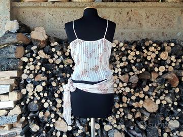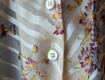 Impalpabile top in seta con base avorio semitrasparente, righe oblique in trama più fitta e stampa di bouquet di fiorellini sui toni caldi (dal giallo al borgogna).