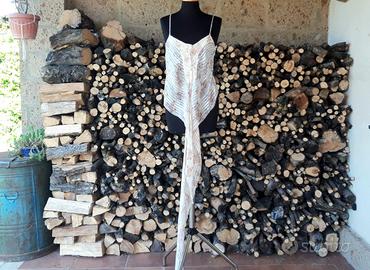 Chiusura con bottoncini in madreperla e due lunghe code asimmetriche da annodare davanti o su un fianco o infiocchettare davanti.