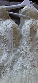 Vendo bellissimo abito da sposa da atelier manifattura italiana , tg 42 regolabile da nastrini schiena , usato poche ore un perfette condizioni . Lavato e disinfettato !!! Regalo cuscino fedi nuovo non usato e vestaglia bianca nuova non usata . NO PERDITEMPO