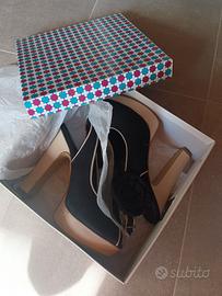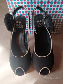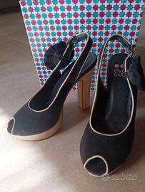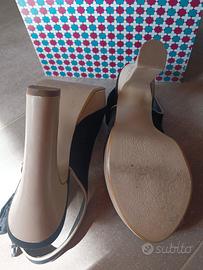 scarpe spuntate alte, colore nero e sabbia, n. 38, aperte sul tallone.