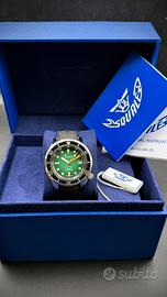 Questa versione si distingue per il raffinato quadrante verde, impreziosito da indici e lancette con SuperLuminova C3 per una leggibilitĂ eccellente anche nelle condizioni piĂą estreme. La cassa in acciaio da 42 mm, con finiture lucide e corona a vite firmata, garantisce robustezza e affidabilitĂ , mentre la lunetta girevole unidirezionale consente una gestione precisa dei tempi di immersione.