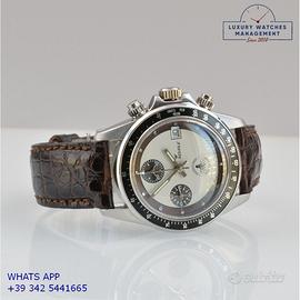 Squale "Polipetto" Cronografo della Polizia di Stato Italiana in acciaio con assegnazione al militare, ghiera acciaio con inserto in alluminio colore nero a scala graduata, vetro zaffiro, doppio quadrante Paul Newman esotico e colore nero by "Polipetto", movimento meccanico a carica manuale, bracciale acciaio Oyster con logo "Polipetto" chiusura deployante originale Squale, cinturino in alligatore lucido colore marrone scuro con fibbia acciaio originale Squale.