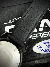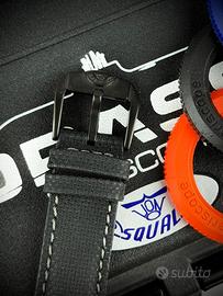Il quadrante nero opaco con indici blu Super-LumiNova BGW9 e il doppio logo Squale (ore 12) e Drass Galeazzi (ore 6) richiamano le origini militari del modello.