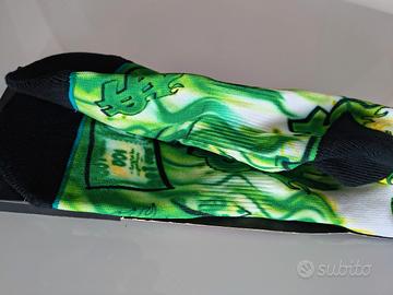 Calzini Stance in taglia L, adatti a numeri dal 43 al 46. Il design presenta una grafica vivace con tonalità verdi e bianche. Prodotto nuovo. Da collezione . Introvabili. Qualità superiore. scritte e disegni in stile street ware usa dollari e fiamme verdi brillanti e lettering in nero.