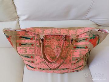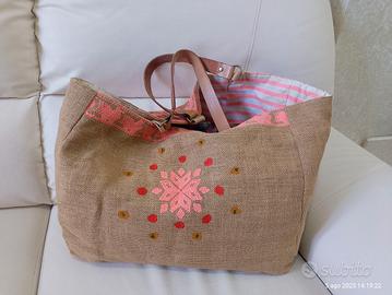 La borsa è particolarissima, ricamata e dipinta a mano di grandi dimensioni cm 41x35x18, perfetta per il mare, lo shopping, come second bag, capiente robusta multiuso alla moda!