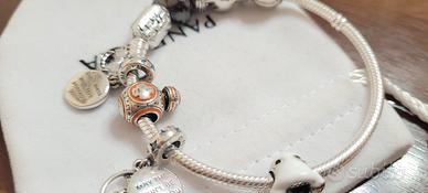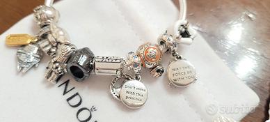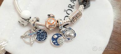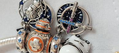 bracciale star wars e 9 charm., Stormtrooper, Chewbecca, bb8, yoda, grocu nella culla, mandaloriano, Millennium Falcon, pendente doppio principessa Leila, pendente doppio spada laser.