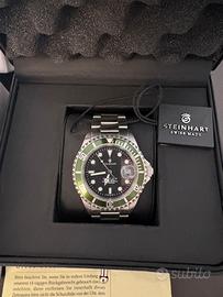 Steinhart Ocean 1 Green 103-0919 – Nuovo, mai indossato Orologio subacqueo Steinhart Ocean 1 Green reference 103-0919, in condizioni perfette come nuovo. • Mai indossato • Completo di originale: custodia Steinhart rigida, cartellini, manuale e fattura di acquisto originale del 2020 Caratteristiche principali: • Cassa in acciaio 316L da 42 mm, spessore 13 mm • Lunetta girevole unidirezionale con insert in ceramica verde • Quadrante nero con indici e lancette Super-LumiNova BGW9 • Movimento automatico Swiss Made ETA 2824-2 (o equivalente SW200), 26 rubini • Impermeabile fino a 300 metri, corona a vite, vetro zaffiro con antiriflesso • Bracciale in acciaio con fibbia deployante e doppio blocco di sicurezza