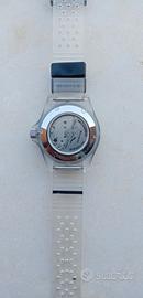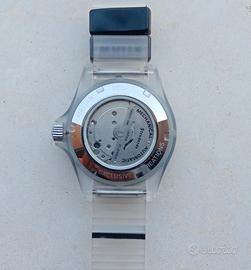 Vendo orologio di marchio Italiano con movimento automatico Myota, scatola con leggera imperfezione (crepa) ma orologio nuovo mai indossato e perfettamente funzionante, corredo come da immagini.