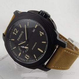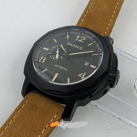 Orologio stile pilota militare. Prodotto dalla fabbrica di orologi Parnis ha un movimento carica automatica con 21 rubini con un affidabile Japan miyota 821A. La cassa in acciaio 316L in PVD nero da 44mm con uno spessore di 15mm. Il quadrante nero con lancette caffè luminescenti reca i l'indicatore H24 alle ore 9 con base a doppio strato sandwich. L'orologio è dotato di vetro minerale antigraffio con fondello in acciaio. Cinturino in pelle 22mm. Resistente a 3 ATM. L'orologio è perfetto pari al nuovo essendo stato indossato poche volte, senza graffi e/o danneggiamenti. Spese di spedizione non comprese.