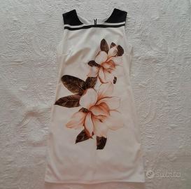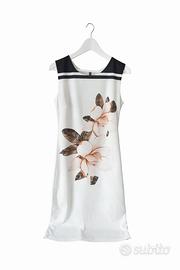 Elegante tubino bianco e nero con dettagli floreali raffinati sul davanti. La stampa magnolia, nelle tonalità pesca e rosa con foglie verde scuro, dona un tocco delicato e sofisticato. Le rifiniture nere su scollo e spalle creano un contrasto chic e armonioso. Taglia M, veste in modo impeccabile valorizzando la silhouette. Cerniera invisibile sul retro per una chiusura discreta e confortevole. Condizioni eccellenti, indossato pochissimo e mantenuto con cura. Perfetto per cerimonie, eventi eleganti o look da giorno ricercati.