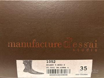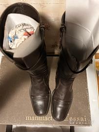Stivale con tacco 2 cm color testa di moro con tomaia in pelle e suola in gomma. Fibbia decorativa ma anche regolabile e cerniera. Spacco centrale anteriore