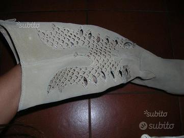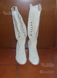 Vendo stivale estivo beige chiaro in renna ecologica, traforato con applicazione di acquila argentata, mis. 35, tacco in legno alto 8 cm.