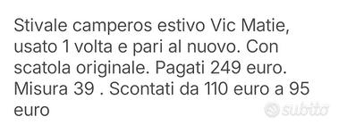Stivale camperos estivo Vic Matie , usato 1 volta e pari al nuovo con scatola originale. Pagati 249 euro . misura 39