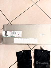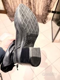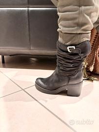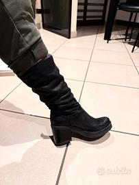 Stivale in pelle nera spazzolata marca “Exito” gamba arricciabile no cerniera suola in gomma con tacco 7 . Interno leggermente imbottito. In ottimo stato