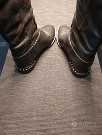 Stivale altezza sotto ginocchio, vera pelle, colore nero, borchie argento sul piede, n. 36 con zeppa interna. (Via Roma 15)