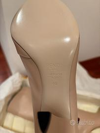 Un modello raffinato con tacco alto e punta arrotondata, impreziosito dal logo Fendi inciso sulla parte alta: un dettaglio discreto ma iconico. Realizzati interamente in pelle naturale, offrono eleganza senza tempo e una silhouette slanciata, perfetta per completare con classe qualsiasi outfit, dal quotidiano al più sofisticato.