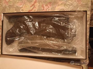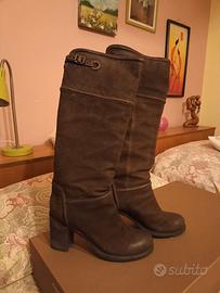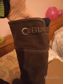 Stivali in pelle scamosciata colore marrone ebano, al ginocchio . Taglia n. 38 tacco 70.