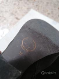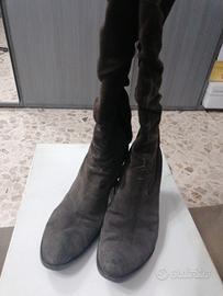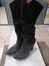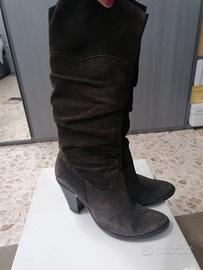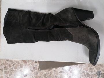 Stivale ottime condizioni in pelle scamosciata verde muschio stile country. Taglia 38 comoda. Io misuro 26cm di lunghezza con pianta 19. Tacco h10cm. Gamba leggermente arricciata h 40 comprensiva di tacco. Circonferenza polpaccio 38. Lampo laterale parte interna a metà altezza No difetti. Indossato poche volte