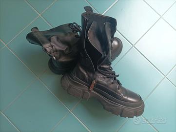 Stivaletti anfibi con suola alta e a carrarmato, con stringhe e lampo laterale di Zara. In vera pelle di colore nero , condizioni perfette indossati un'unica volta, numero 41 ,per inutilizzo vendo.