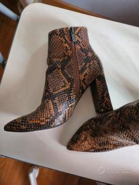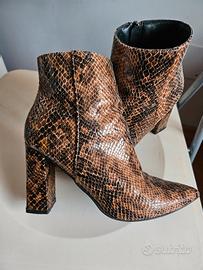 Stivaletti Primadonna fantasia pitonata sul marrone, numero 38, con cerniera laterale e senza plateaux. Altezza tacco 9,5 cm. Utilizzati molto molto poco.