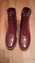 Vendo stivaletti alla caviglia nuovissimi, mai indossati come si vede dalle foto, di Menbur, in similpelle color bordeaux con piccole borchie dorate sul lato e sul bordo superiore e poi una decorazione dorata che contorna la suola, zip laterale, punta arrotondata, suola in gomma e tacco largo molto comodo alto 7 cm, rivestimento interno con tessuto caldo, misura 40. Prezzo eu 50 leggermente trattabile. Per vederli e/o provarli scrivere all'indirizzo mail indicato.
