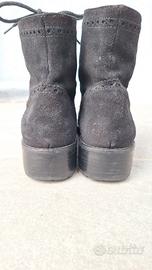 Scarponcini alla caviglia con 4 occhielli e 3 gancetti per legarli davanti con i lacci neri tono su tono. Modello polacchino/tronchetto in suede con tacco basso 3,5 cm, altezza gambale 13,5 cm. Dettagli ricamati (broguering) tipo francesine. Numero 37, lunghezza suola 27 cm, lunghezza soletta interna circa 23,5/24 cm. Marca Daniele Ancarani made in Italy in vera pelle scamosciata fuori e liscia dentro. Alta qualità. Usate pochissimo come si vede anche dalle suole, nessun difetto da segnalare. Perfetti per l'autunno-inverno. Non ho più la scatola originale, spedisco in un'altra scatola da scarpe.