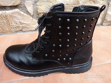 Stivaletti alla caviglia con un design audace e grintoso. - Tomaia in ecopelle nera. - Dettagli con borchie metalliche a cono. - Chiusura con lacci. - Suola in gomma resistente.