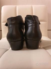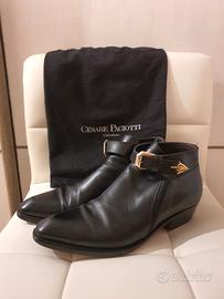 Iconici stivaletti vintage Cesare Paciotti originali anni '90. Modello alla caviglia, stile Jodhpur, con punta affusolata. Pelle nera con fibbia color oro con emblema a forma di pugnale (simbolo iconico della maison) che funge da dettaglio sul cinturino. In ottimo stato. Numero 8.5