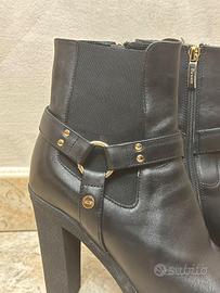 Stivaletti Cesare Paciotti originali da donna, taglia 39, in pelle nera di alta qualità. Modello elegante con tacco alto e plateau, zip laterale e dettaglio cinturino con anello metallico dorato. Linea femminile e grintosa, perfetti per outfit chic o rock.