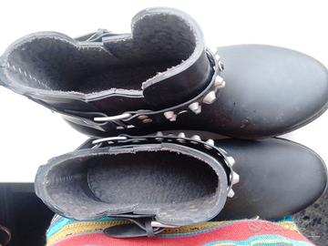Stivaletti in gomma con bracciale alla caviglia borchie e strass, in ottime condizioni, è saltata una linguetta come si vede ultima foto. Ritiro a mano a Mestre/Venezia. Disponibile spedizione