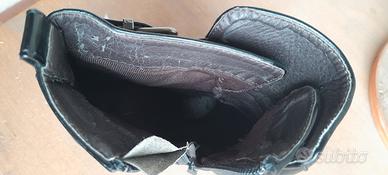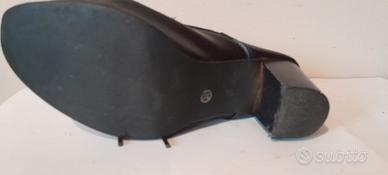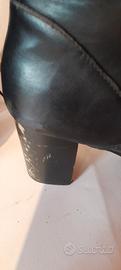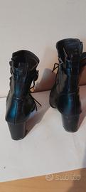 Stivaletti stringati neri con tacco - Stile Rock/Casual Bellissimi stivaletti neri in similpelle, modello stringato con tacco largo e comodo. Perfetti per dare un tocco grintoso a qualsiasi outfit, dai jeans ai vestitini. Caratteristiche principali: Colore: Nero classico. Dettagli: Stringhe anteriori per regolare la calzata, fibbia decorativa laterale e pratica cerniera interna per indossarli velocemente. Tacco: Tacco largo (circa 6-7 cm), molto stabile e ideale per l'uso quotidiano. Stile: Versatili, ideali per look rock, goth o casual chic. Condizioni dell'articolo: Le scarpe sono state amate e utilizzate, per questo il prezzo è molto vantaggioso. Segnalo per correttezza: Interno: La fodera interna sintetica presenta dei segni di spellamento nella parte superiore (come visibile in foto), che però non compromettono il comfort né l'estetica una volta indossate. Tacchi: Presentano alcuni graffi superficiali sul rivestimento (visibili nelle foto di dettaglio). Suola: In buone condizioni, ancora con molto grip.