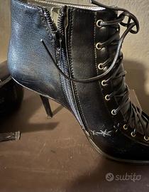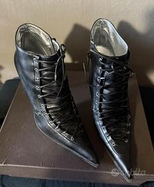 Chiusura con lacci e cerniera laterale. Made in Italy . Tacco 6 cm circa. Ottime condizioni: tacco e suola perfettamente integri.