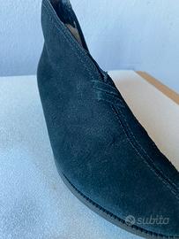Vendo stivaletti da donna in pelle scamosciata nera, misura 36, con fodera interna in pelliccia sintetica per tenere i piedi al caldo nelle giornate più fredde. Modello elegante e confortevole, con chiusura laterale con cerniera e suola resistente.