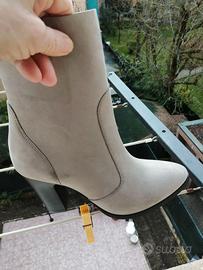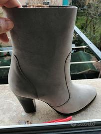 Eleganti stivaletti in eco camoscio. - Modello a mezza gamba. - Tacco comodo. (cm9) - Zip laterale per facilitare la calzata. N 39 . Nuovi perfette condizioni. Color bianco ghiaccio