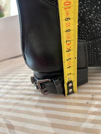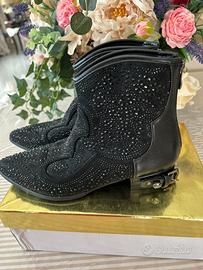 Realizzati con inserti in pelle e decorazioni di strass scintillanti, hanno un design elegante e particolare. Chiusura con zip posteriore per una calzata comoda e pratica.