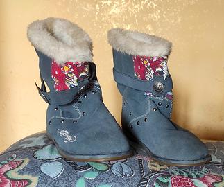 Stivaletti donna bassi in vera pelle scamosciata Skull Floral senza cerniera foderati in pelliccia sintetica.