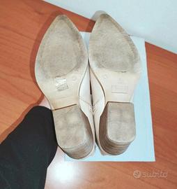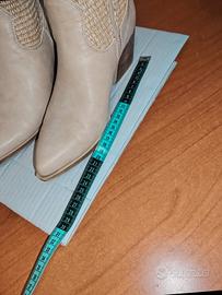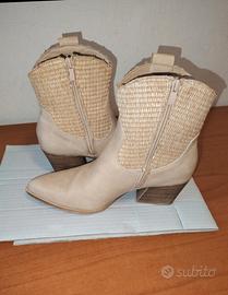 Stivaletti stile texano, ideali per la mezza stagione e l'estate. Il design unico combina una tomaia in morbida similpelle color panna con un inserto in paglia intrecciata sul gambale per un perfetto tocco boho-chic. Hanno una comoda chiusura con cerniera laterale interna e un tacco a blocchetto stabile, facile da portare tutto il giorno. La parte davanti a punta non deve spaventare, sono comunque molto comodi, anche per me che ho la pianta del piede abbastanza larga. Li vendo per inutilizzo in quanto ne ho già svariati modelli simili. Condizioni eccellenti, usati solo un paio di volte. Misure in foto.