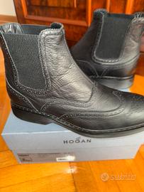 Stivaletto Chelsea H576 in pelle nera martellata presentato con impunture e cuciture classiche in stile brogue. Inserti elastici laterali per agevolare la calzata. Nuovo sottopiede removibile in memory foam di 0,8 cm. Suola in gomma leggera. Altezza totale circa 3 cm. Taglia 11. Prezzo di listino 450 euro