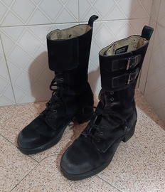 Stivaletti in camoscio nero, con lacci e due fibbie laterali, tacco basso, Rock by Shoe Factory, Made in Italy. Scarpa n. 35. In discrete condizioni, lacci leggermente usurati.