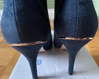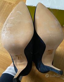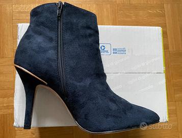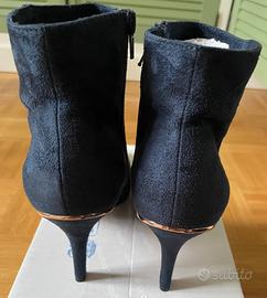 Tronchetti a punta in pelle scamosciata color blu scuro, con cerniera all’interno e profilo del tacco in metallo dorato. Numero 40. Altezza tacco 9,5 cm. Nuove, mai indossate.