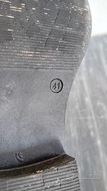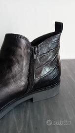 Stivaletti in pelle nera con frontale liscio e pannello posteriore effetto coccodrillo. Zip laterale per una calzata pratica, pull tab posteriore e suola in gomma antiscivolo. Altezza gambale circa 12–13 cm, tacco 3 cm. Calzata regolare. Condizioni ottime indossati poco ore, modello versatile per uso quotidiano e look casual‑eleganti.