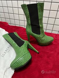 Stivaletti in vero pitone e vera pelle, marca ICEBERG, made in Italy di colore verde da donna. Altezza totale cm. 32, pacco cm. 12, zeppa cm. 4. Numero 39